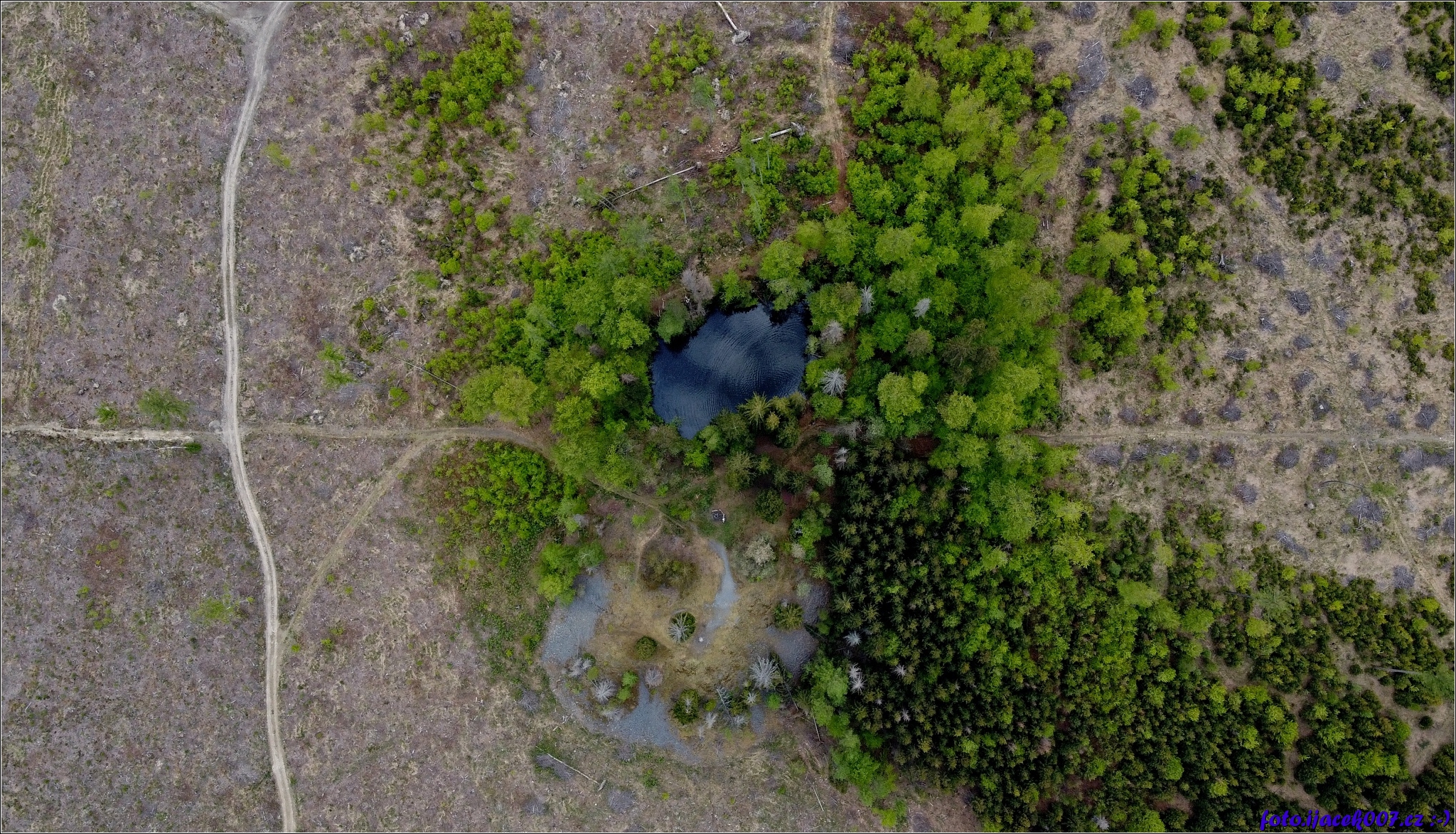 Pohled na zatopený břidlicový lom z výšky.