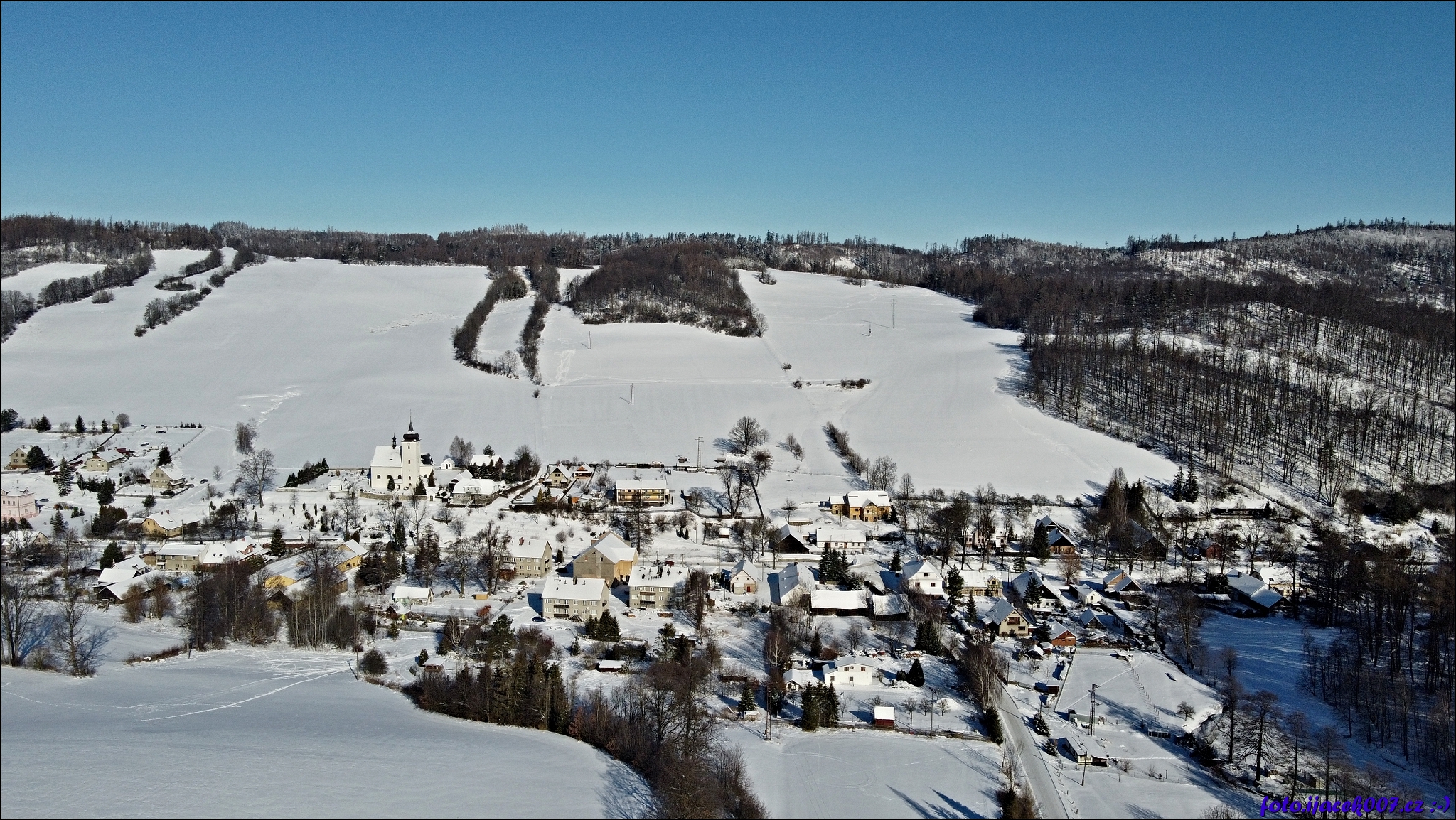 Pohled na zasněženou vesnici.