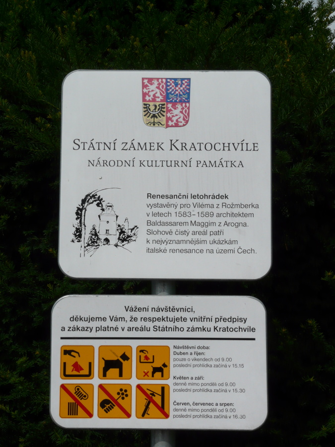 Cedule vítající navštěvníky u zámku kratochvíle.