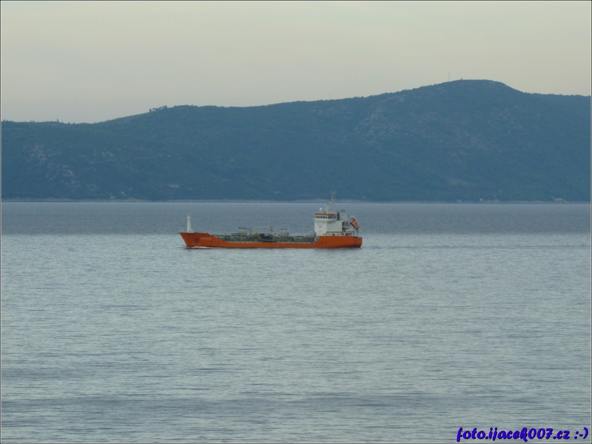 pohled na nákladní loď plující vedle chorvatského pobřeží