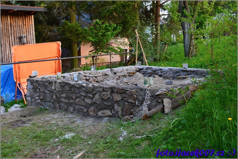 pohled na téměř hotovou zídku i s zabetonovanými patkami pro trámy.