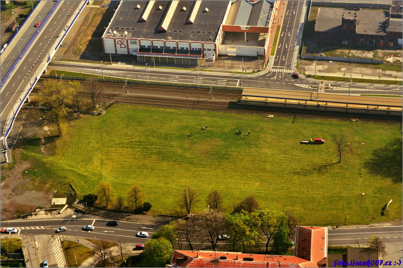 pohled na louku u nádraží stodolní odkud se balon vznesl,