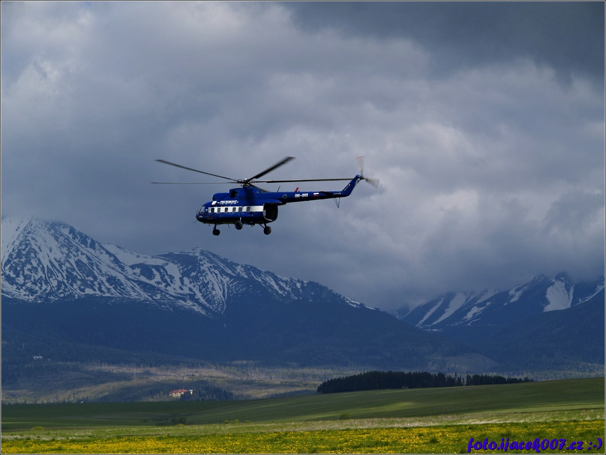 pohled na letící vrtulník v pozadí vysoké Tatry