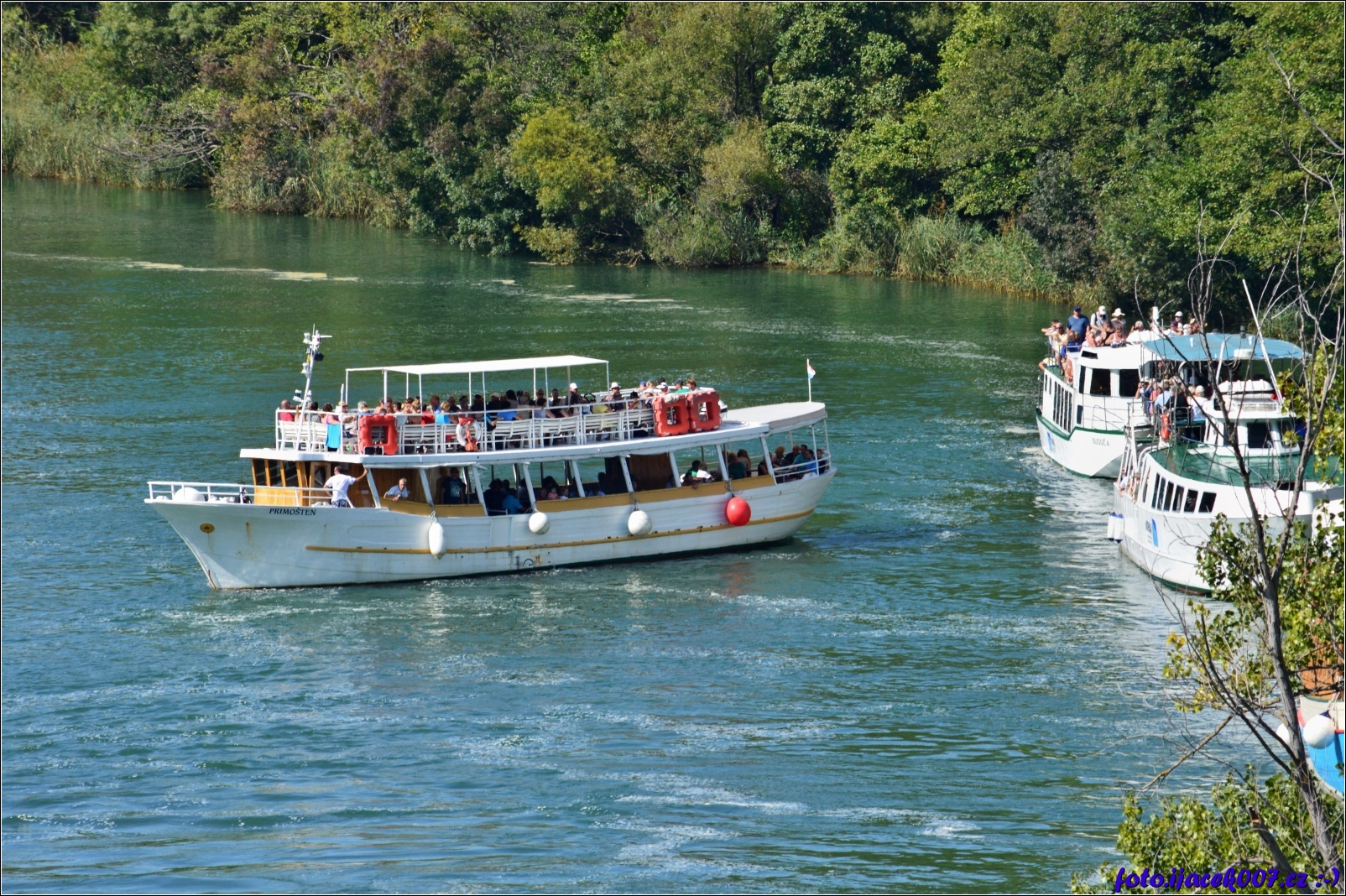 Lodní doprava k chorvatskému národnímu parku Krka po řece. Doprava je součástí vstupného.