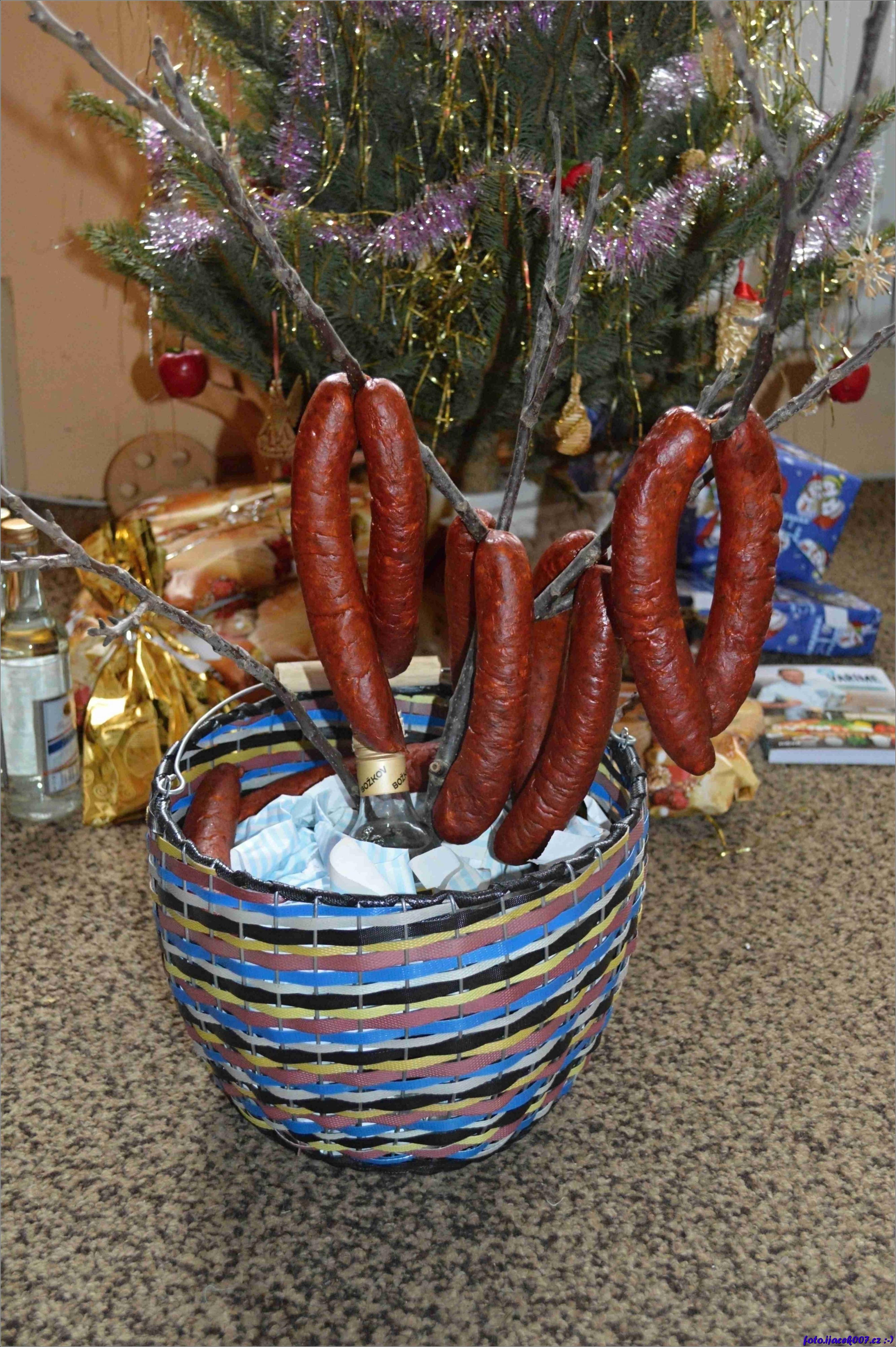 dědův klobásovník podepřený flaškou
