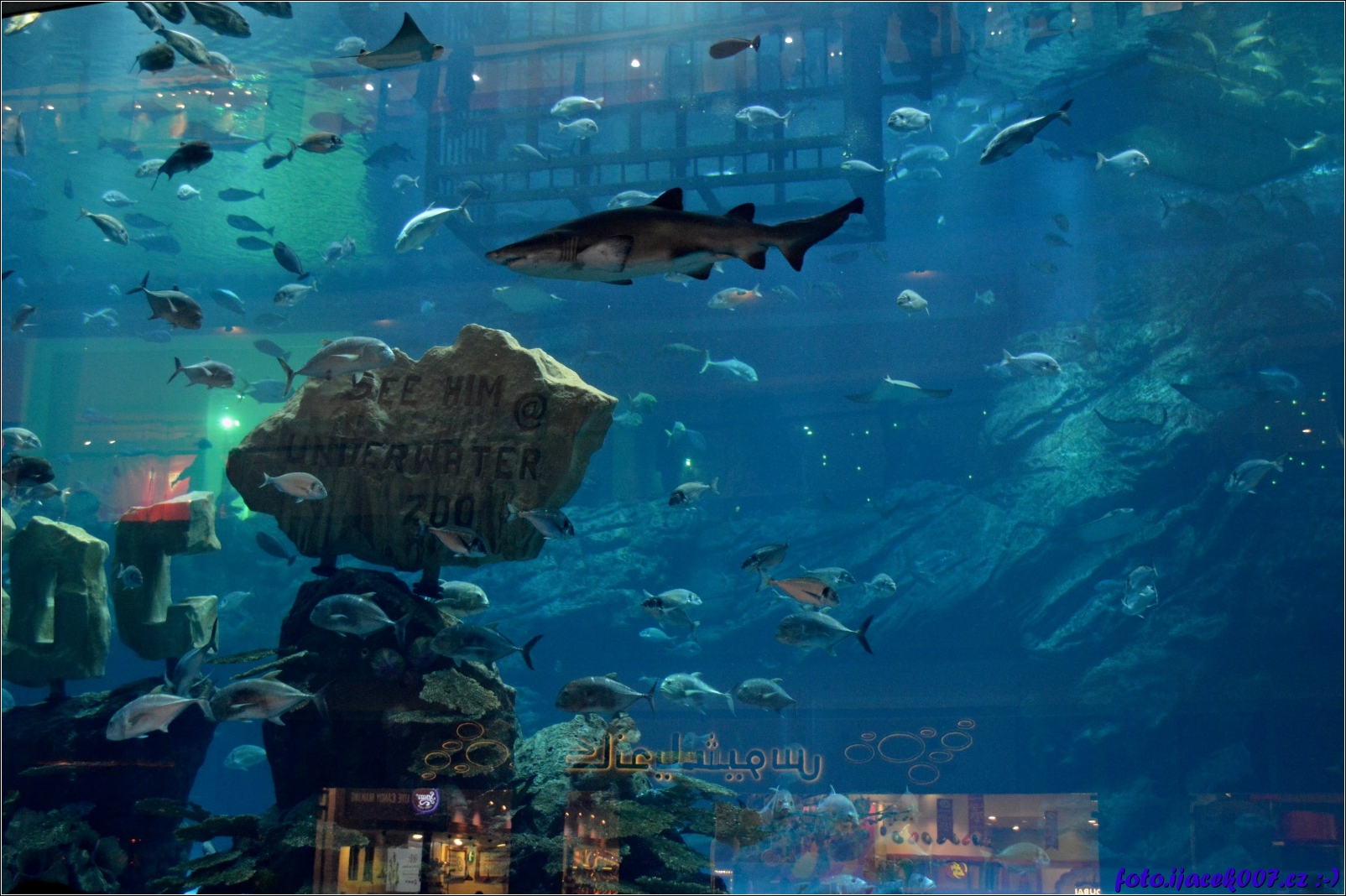 žralok ale i další ryby v obrovském akváriu v nákupním centru Dubaje