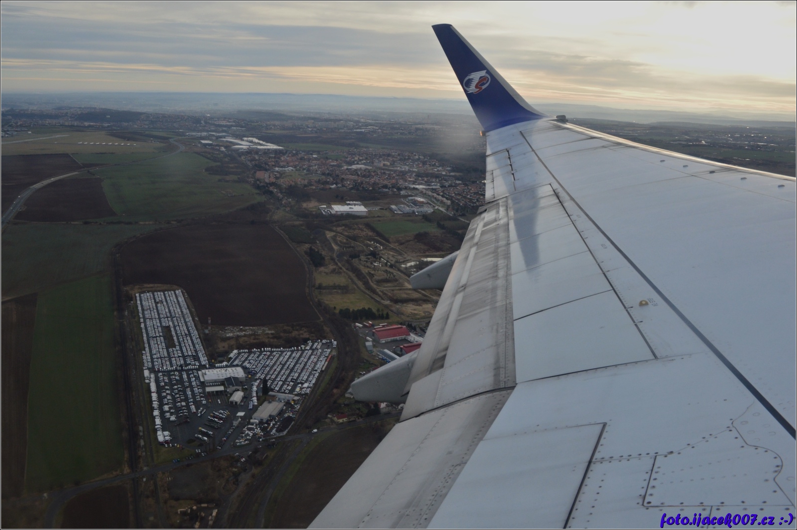 pohled na zem pod křídlem letadla než nabere letadlo tu správnou výšku