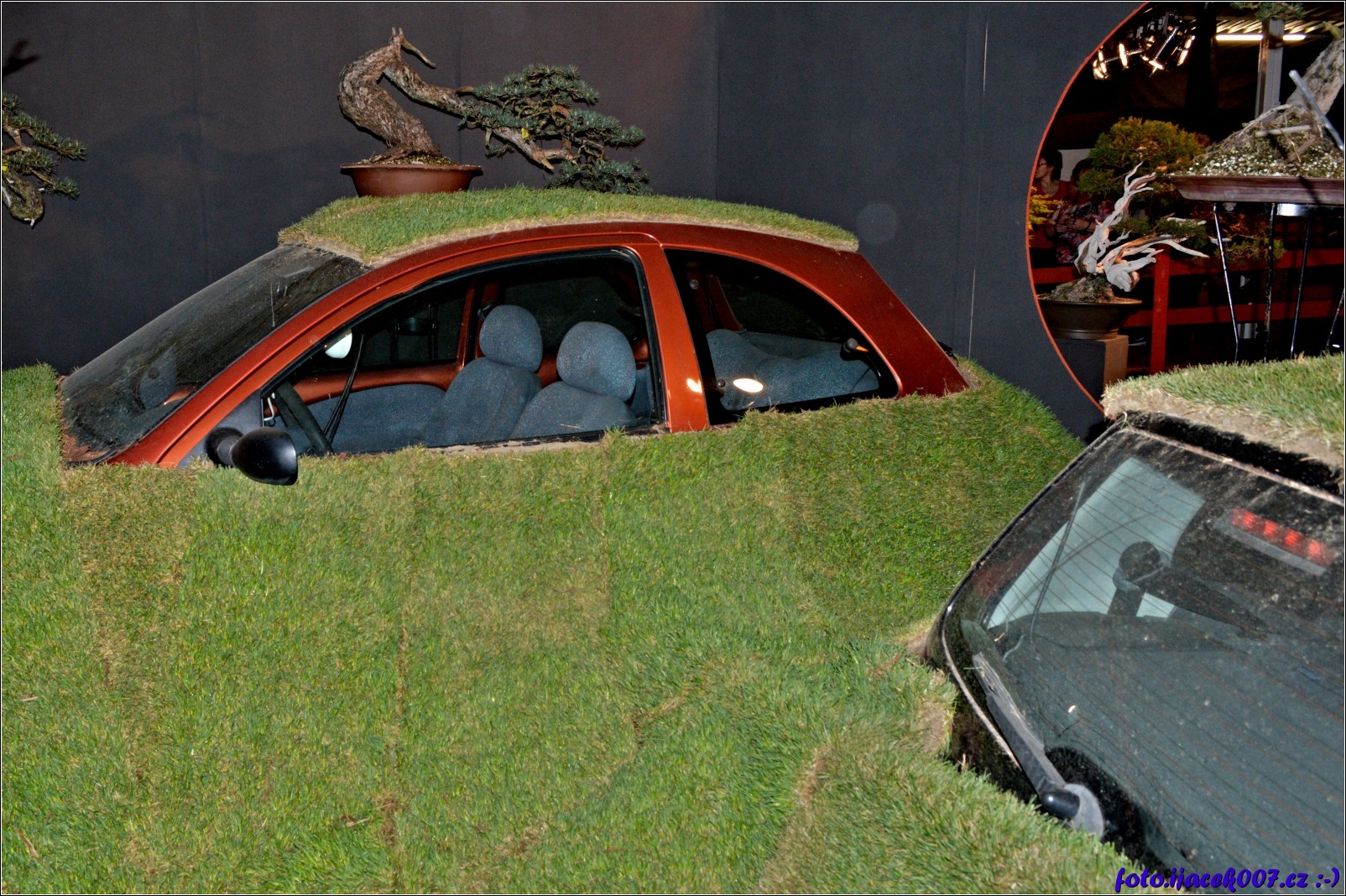 auta skryta pod trávou byla součástí výstavy bonsaji
