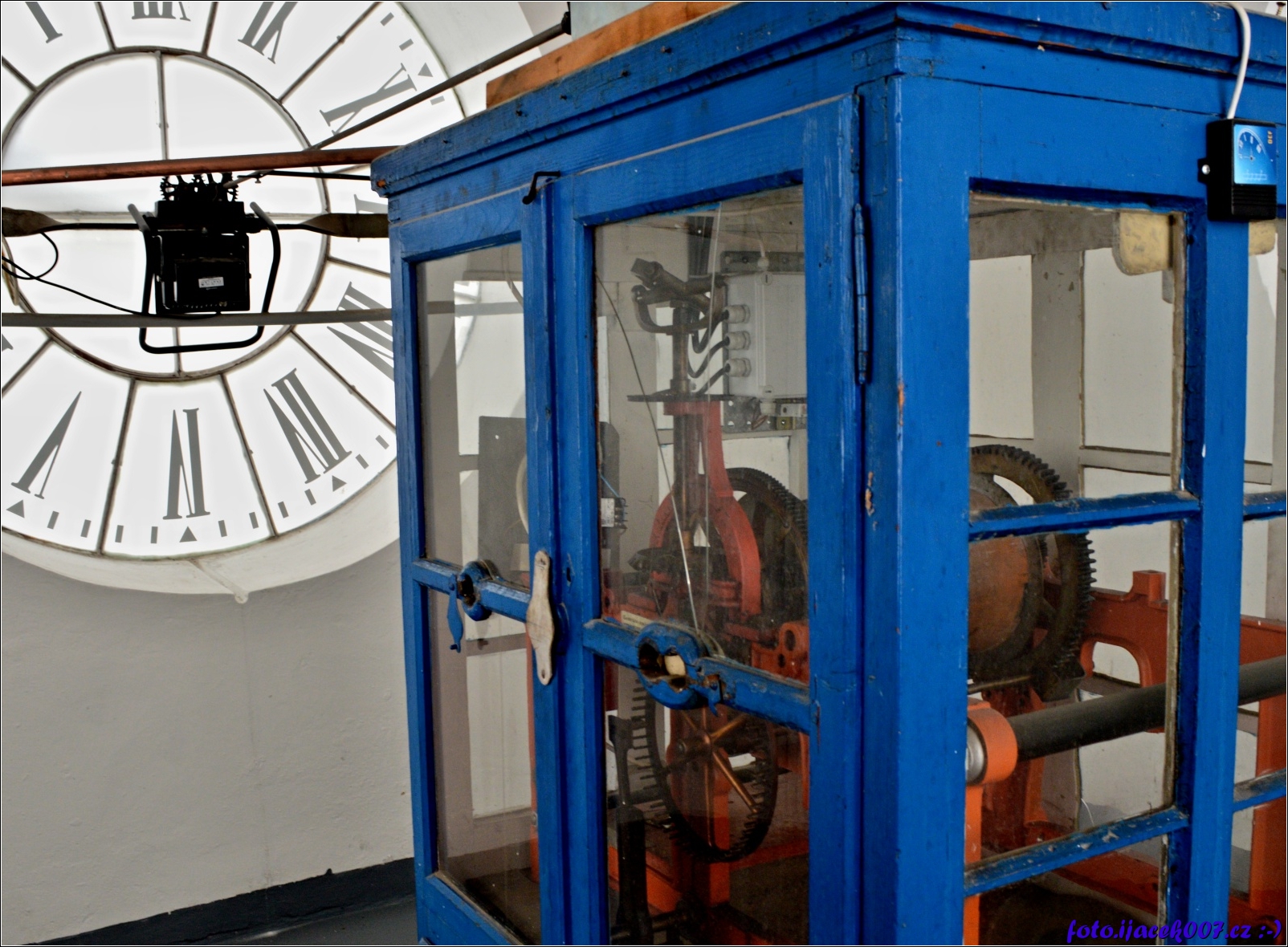 pohled na hodinový stroj který je ve všech čtyřech stranách věže.