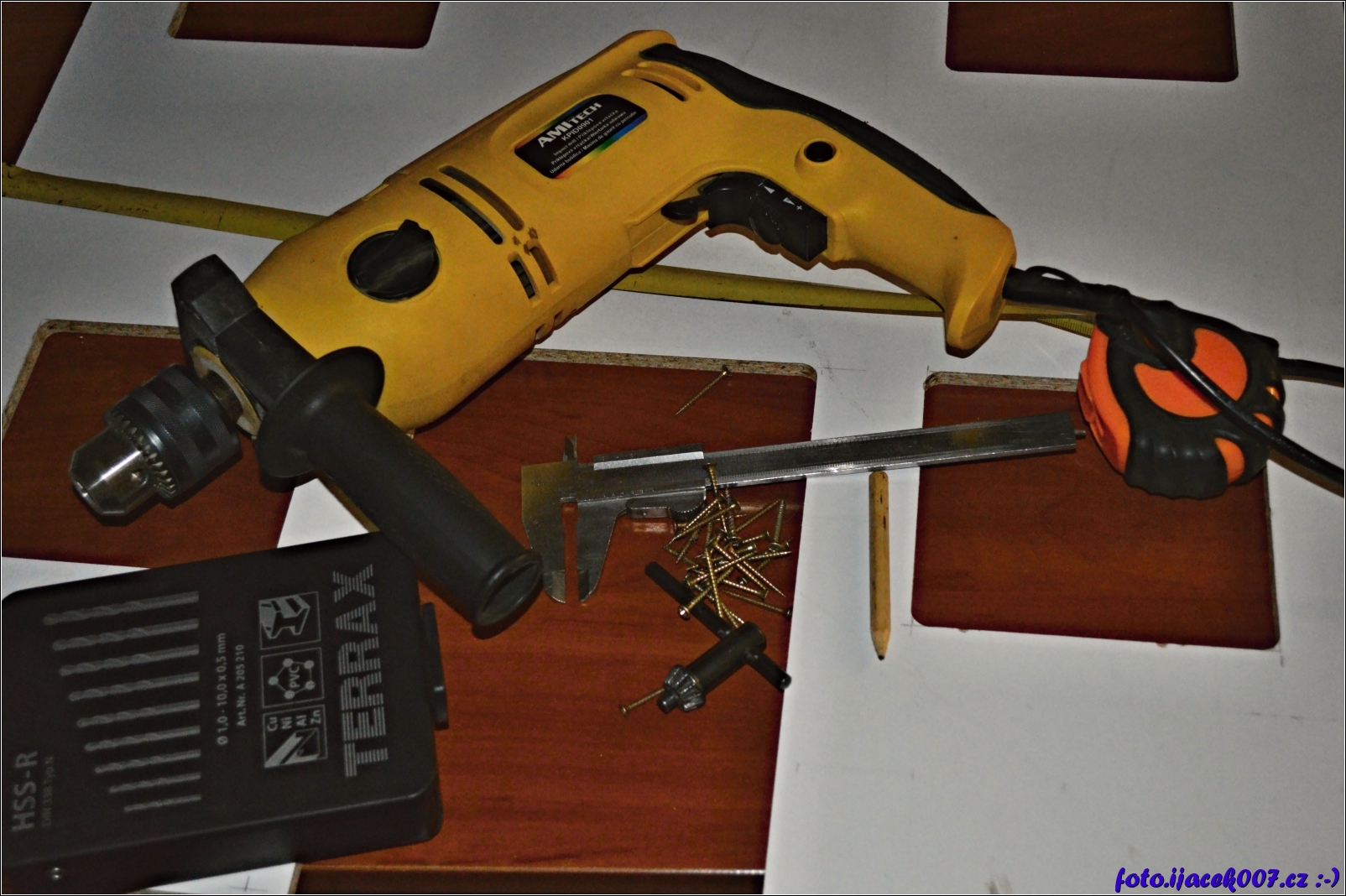 Potřebné nářadí na složení domečku vrtačka sada vrtáku používal jsem jen dva metr a šroubovák
