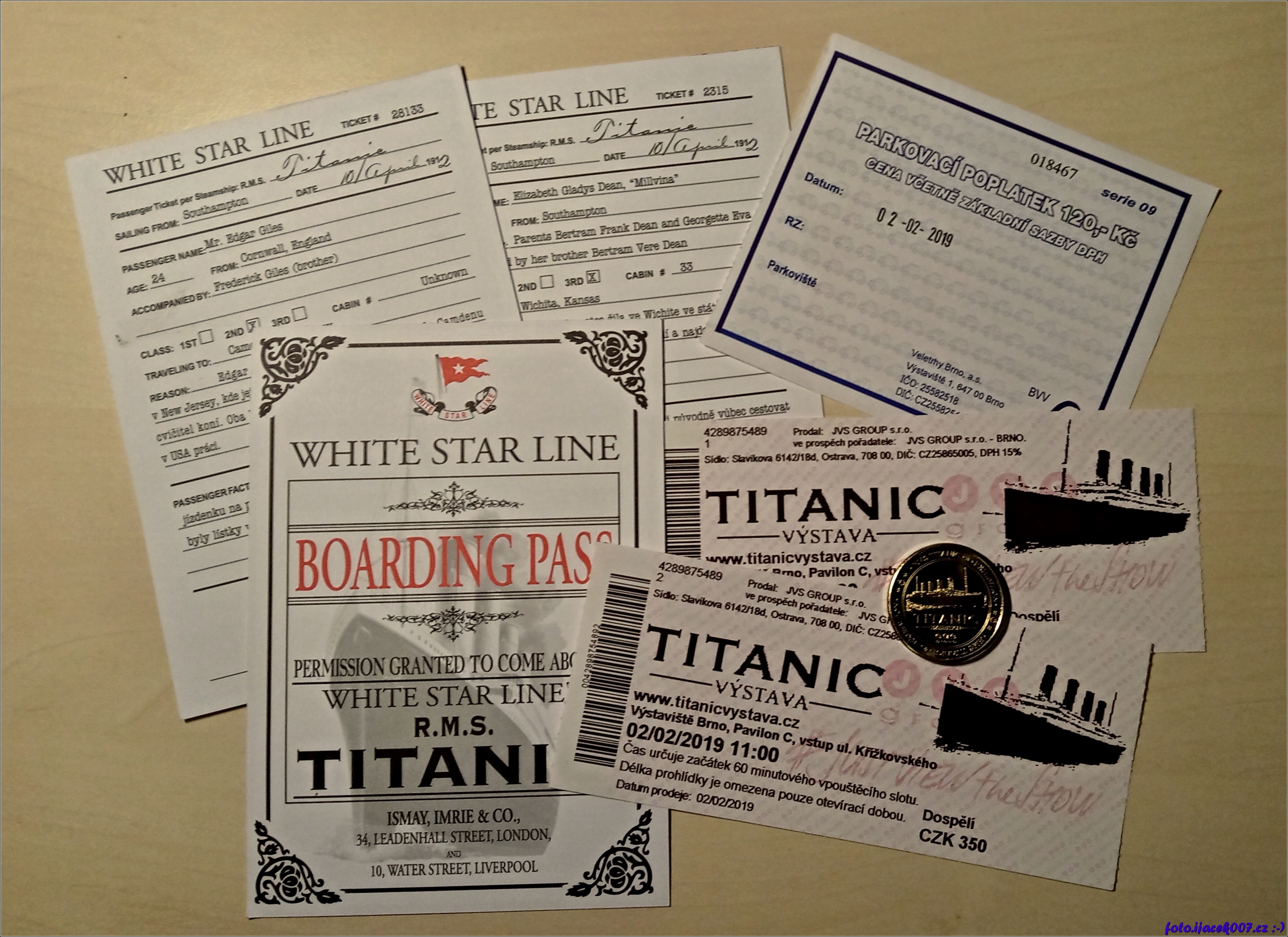 pohled na vstupenky palubní lístky pamětní minci a v poslední řadě na lístek za parkování