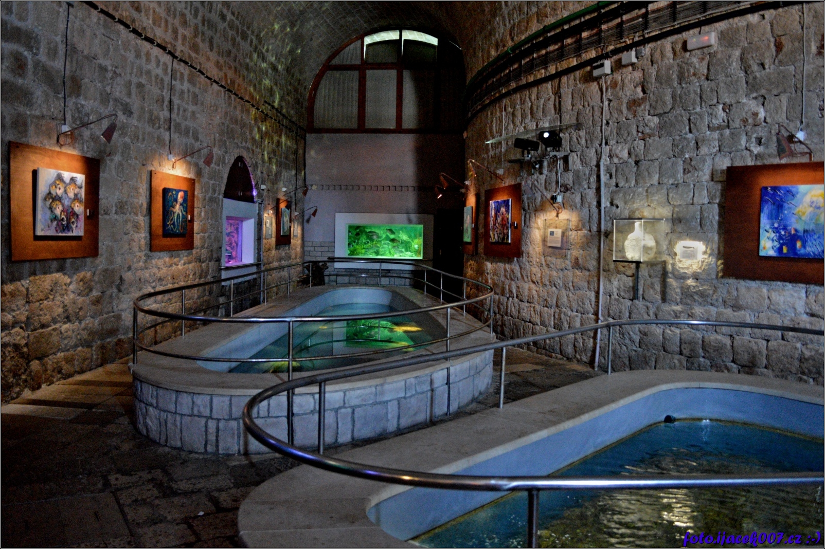 Pohled na akváruia které jsou součásti uzea v Dubrovníku