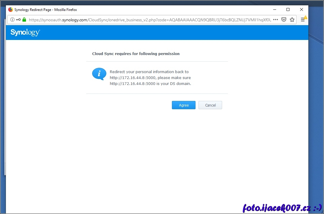 Po přihlášení ještě musíte synology povolit přístup k vašemu účtu.