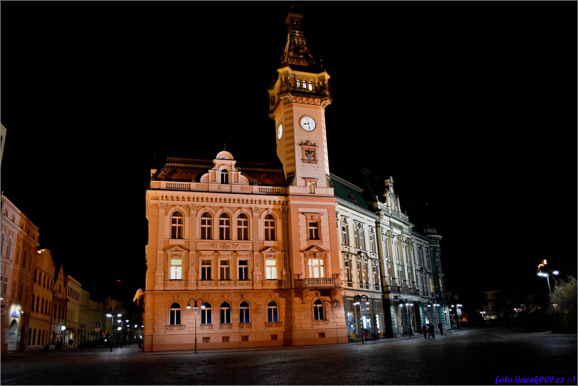 Pohled na osvětlenou krnovskou radnici.