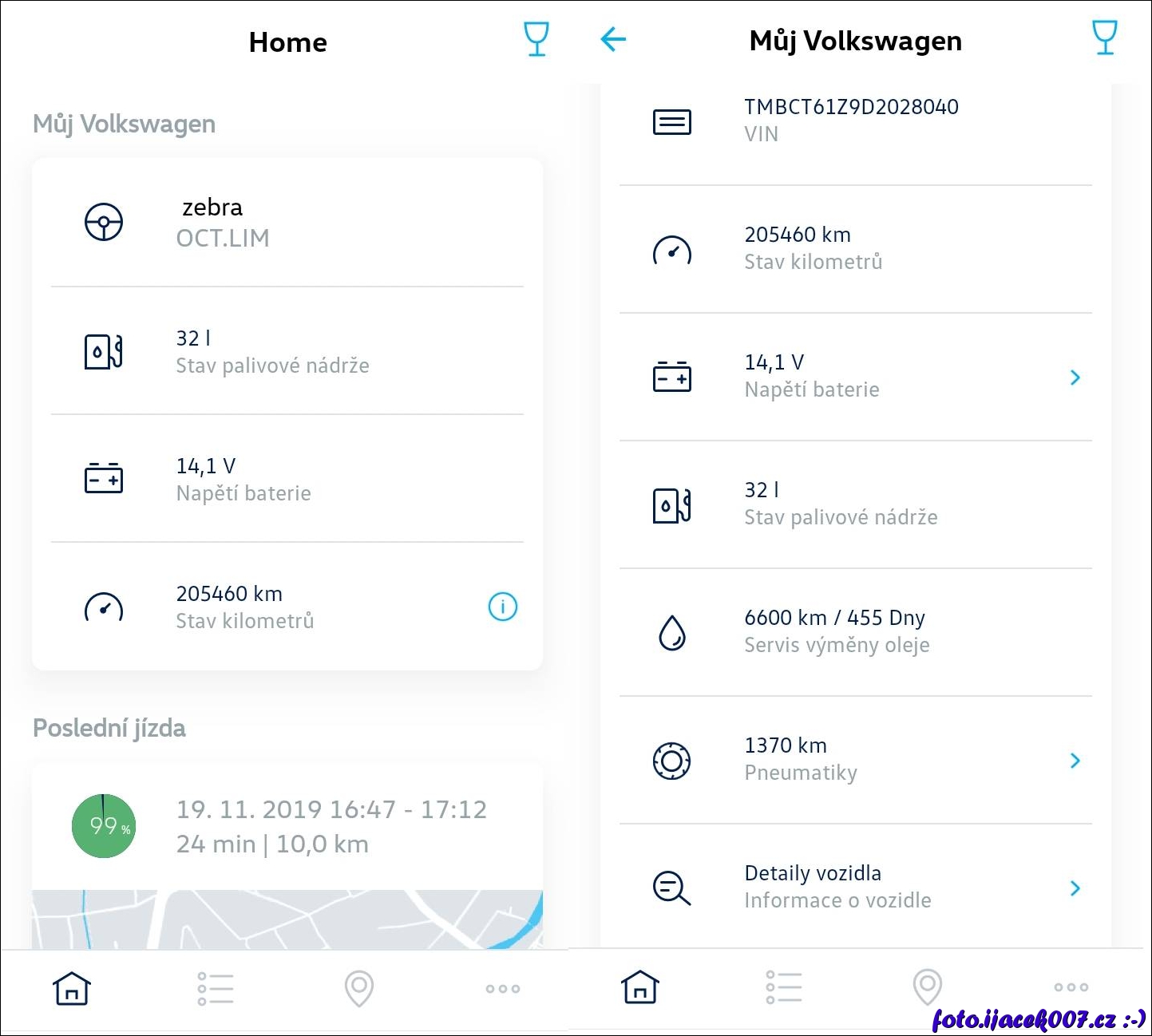Pohled na obrazovky s informacemi o Autě.
