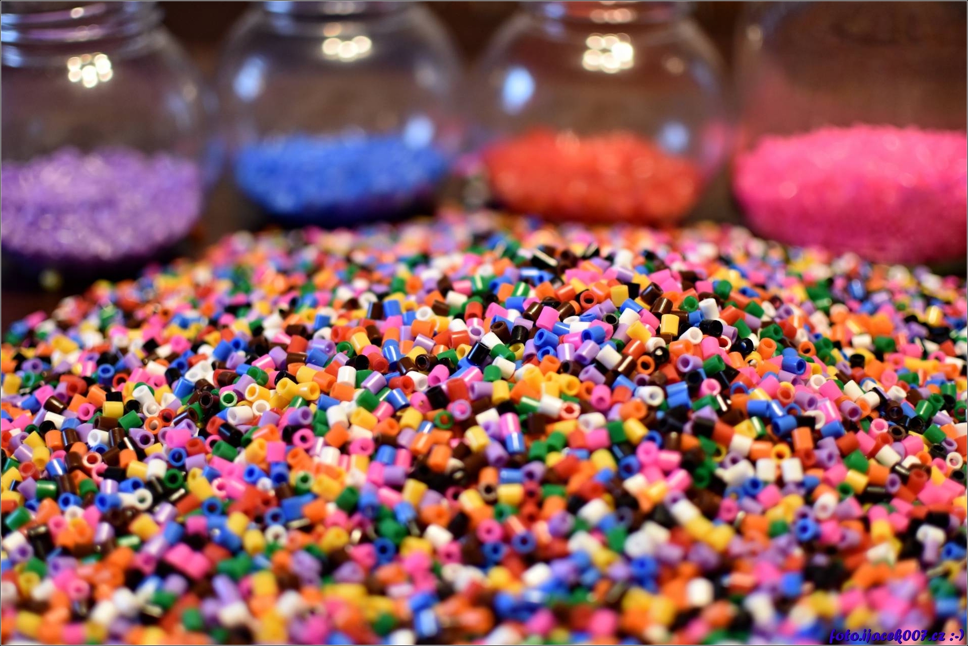 Pohled na neroztříděné barvy v pozadí již roztříděno v dózách. Korálky Pyssla.