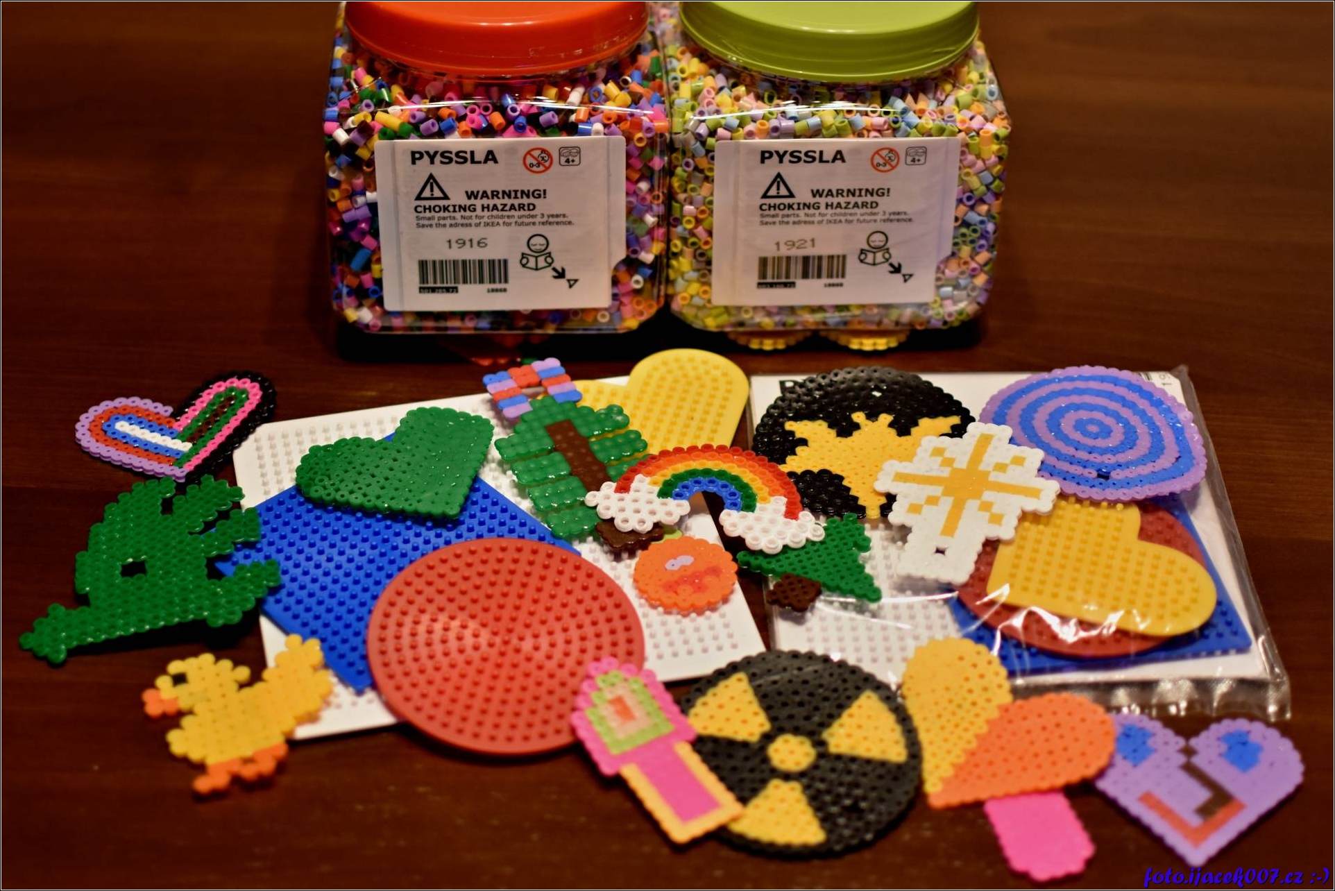 Pohled na již hotové vzory předlohy a dvě balení korálků s rozdílnými barvami. Korálky Pyssla.