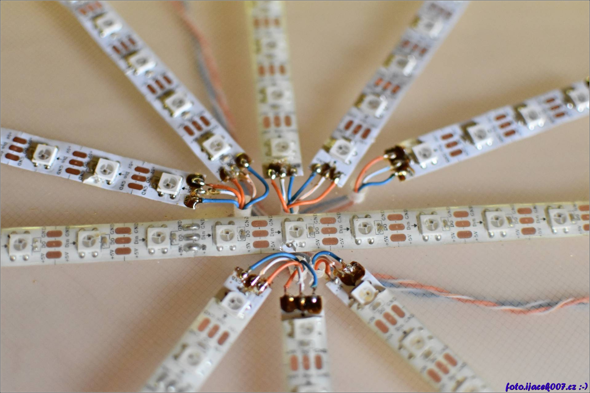 Detail zapojení středu "dárku". Jsou vidět napájené propojky k led páskům.