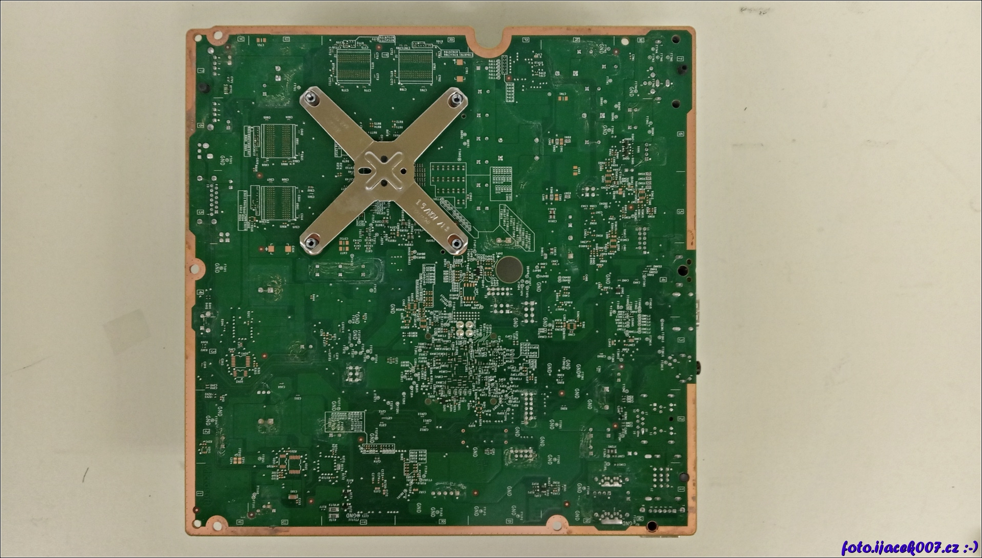 Pohled na spodní část základní desky konzole xbox 360 a na klip držící chladič.