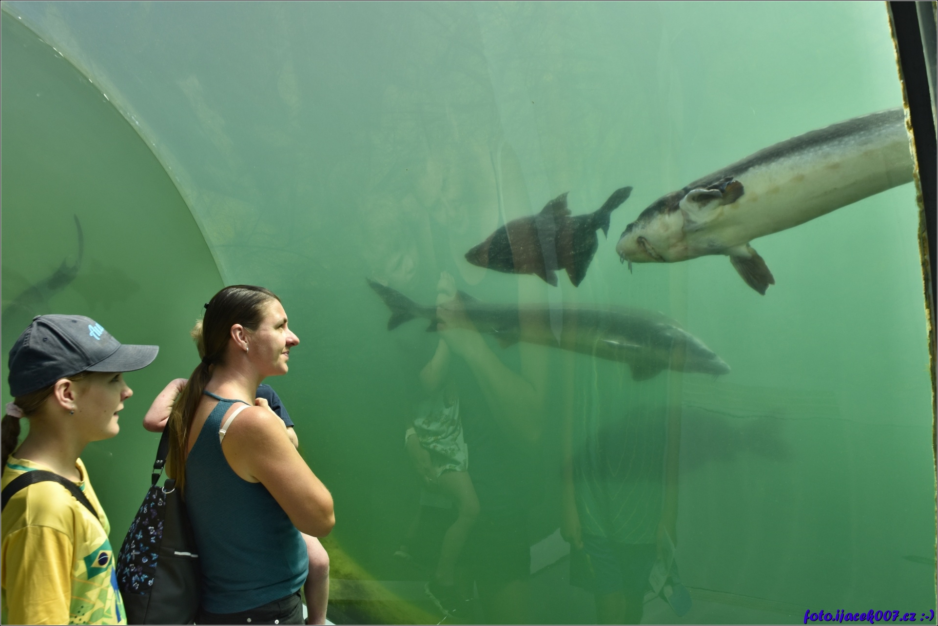 Pohled na živočichy pod vodou ze skleněného tunelu.