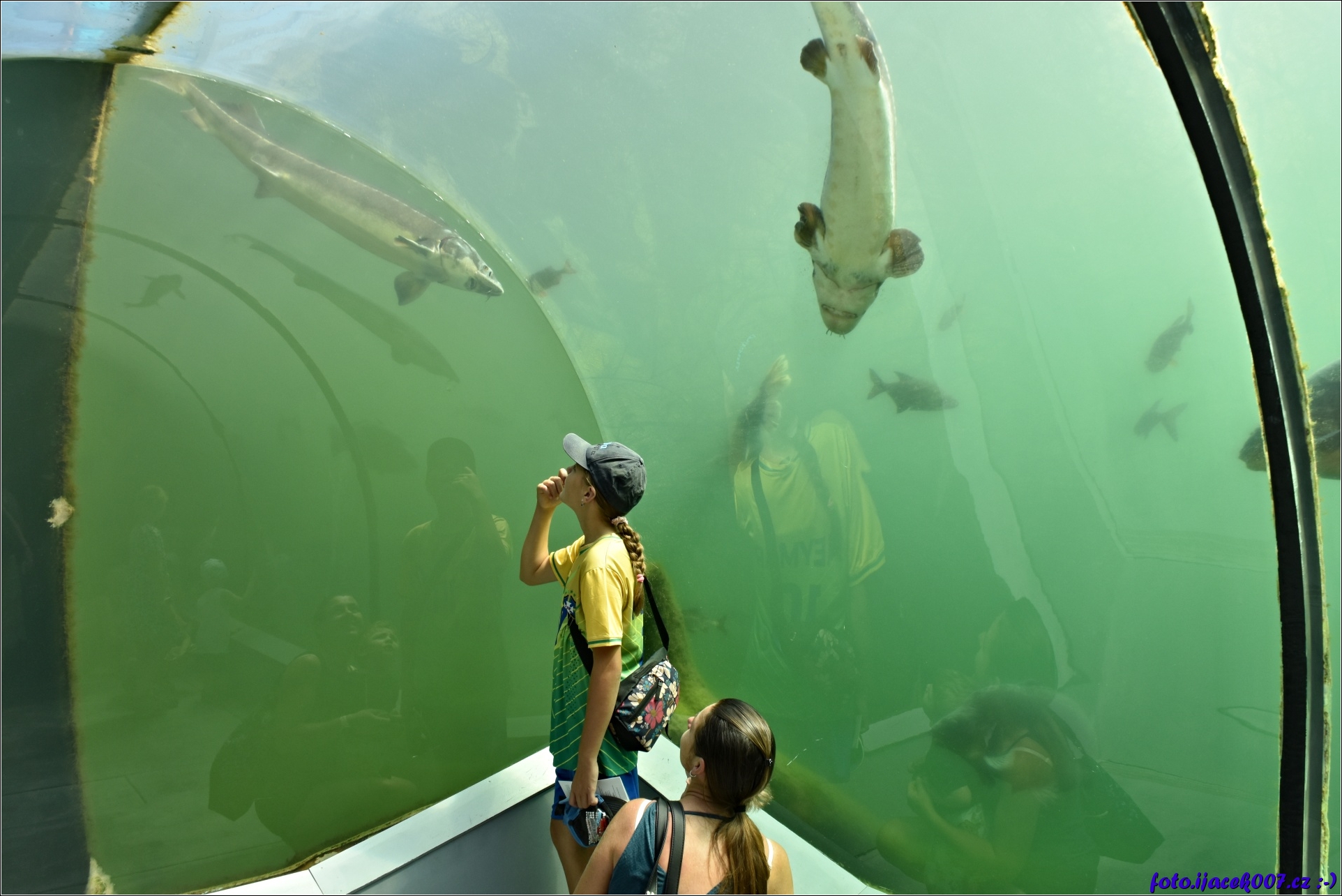 Pohled pod vodní hladinu ze skleněného tunelu.