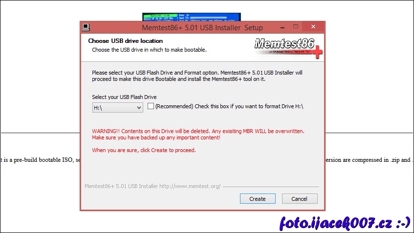 výběr disku pro vytvořením boot media a varování o smazání dat na zvoleném disku