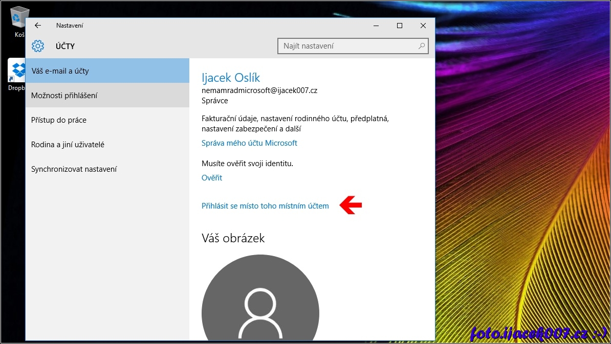 Volba změna přihlášení na místní profil.