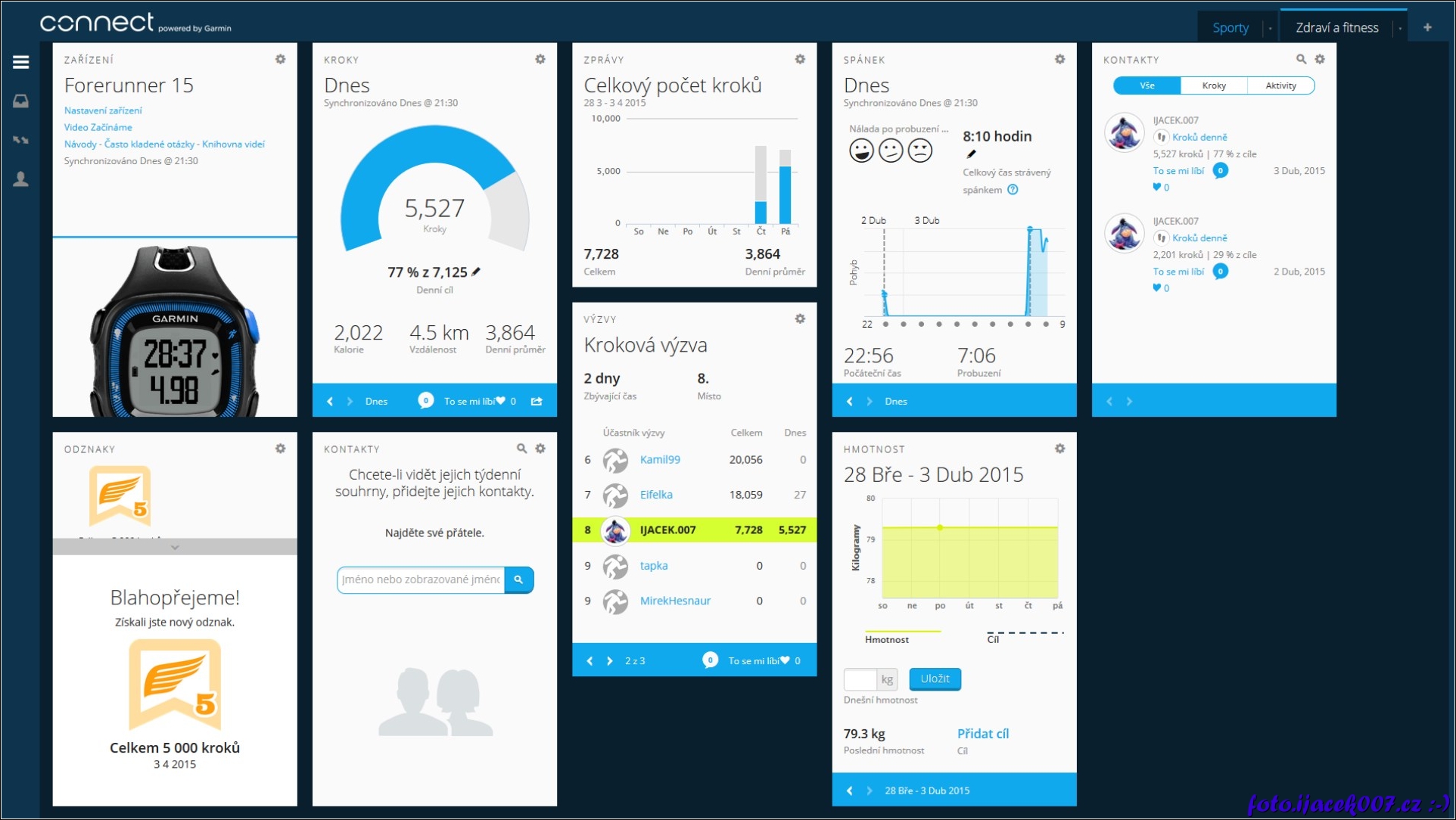 plocha s informacemi webové stránky Garmin connect