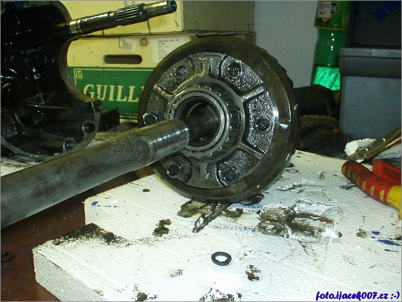 pohled na ulomený šroub v diferenciálu ze kterého vystupuje Poloosa