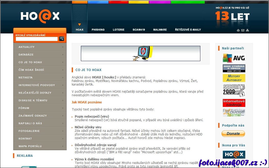 webová stránka popisující Hoax a další poplašné a nepravdivé správy