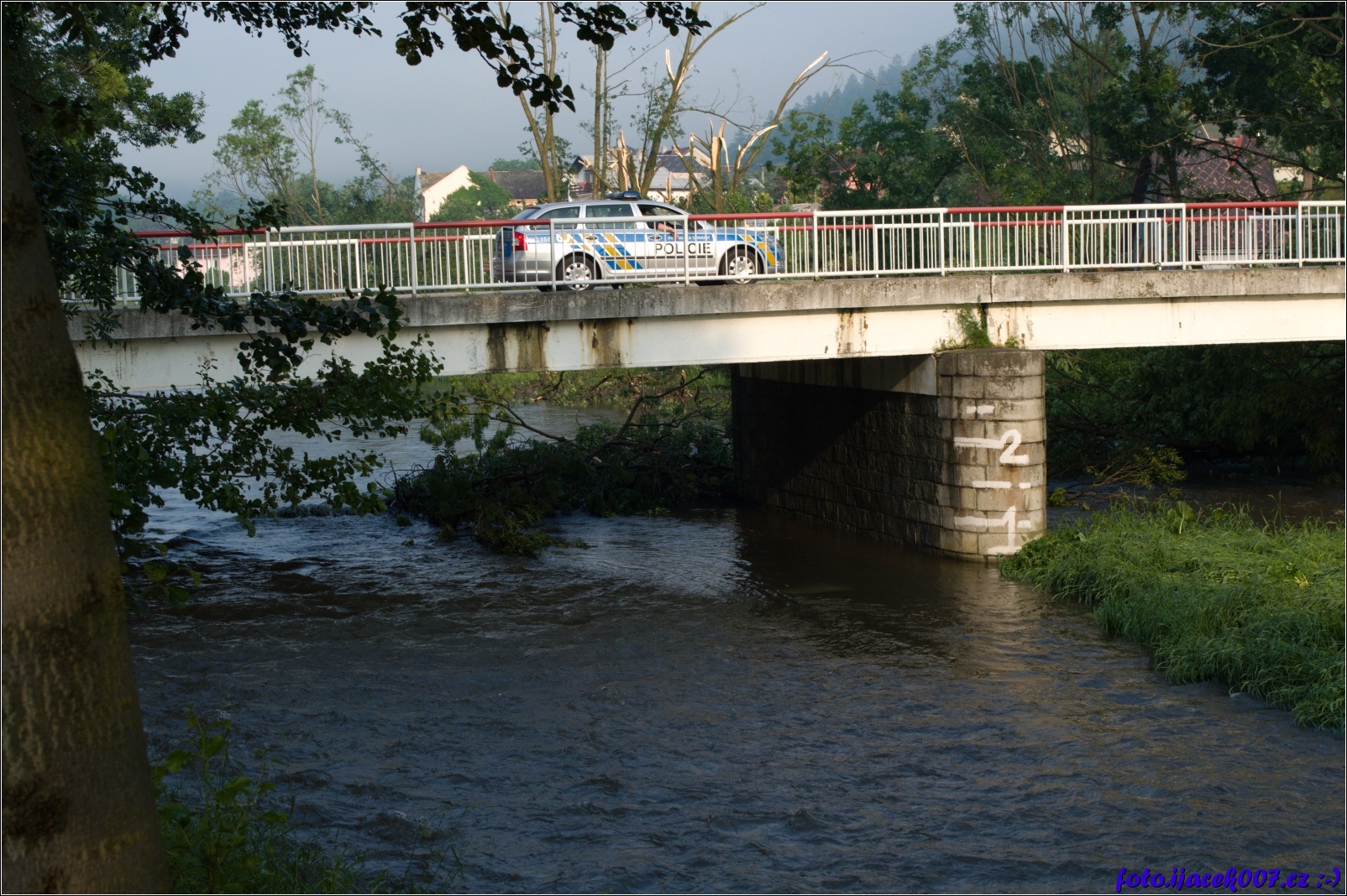 okolo poškozených domu hlídkovaly policisté aby nedocházelo k vykrádání v pozadí je vidět hodně poškozený strom přímo za policejním autem