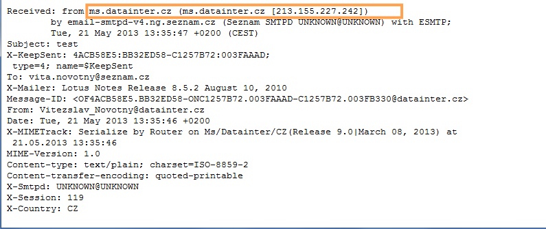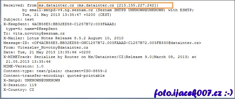 hlavička emailu s ip adresou odesilatele