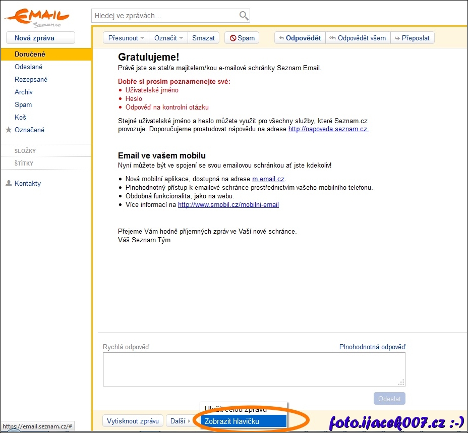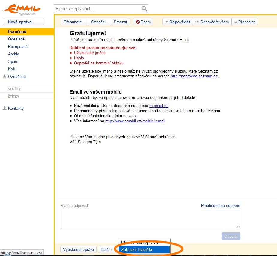 zobrazení hlavičky emailu ve webmailu seznam.cz