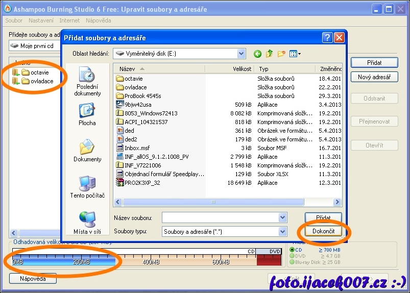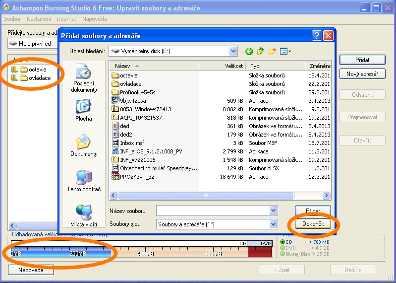 dokončení výběru adresářů a souboru pro vypálení na disk