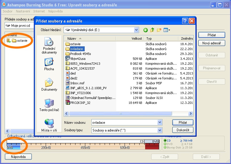 ukázka kolik místa na disku zabírají již vložená data