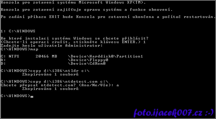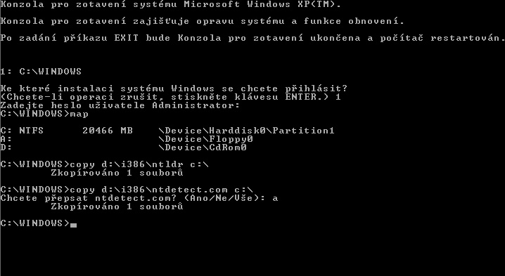 instalator windows XP recovery konzole příkazový řádek