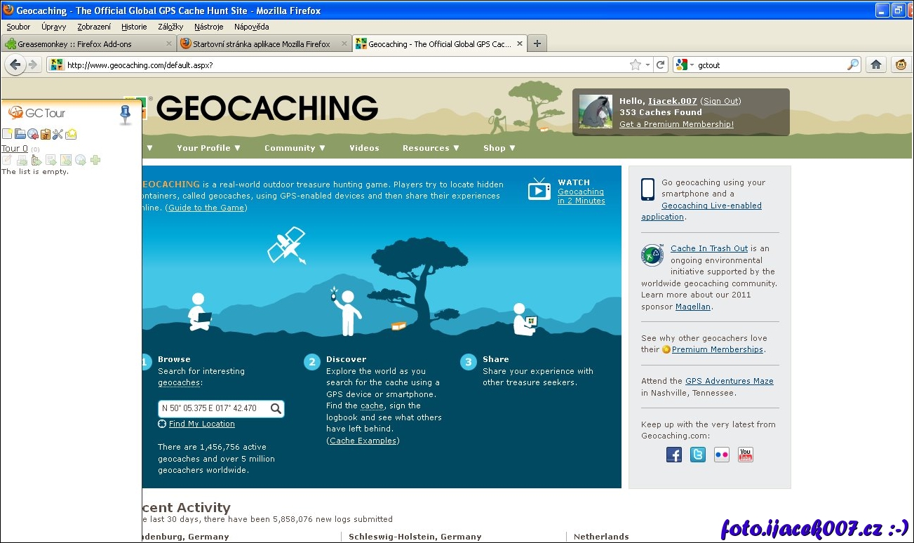 Webová stránka Geocachngu a rozšíření Gctour v levé části stránky.
