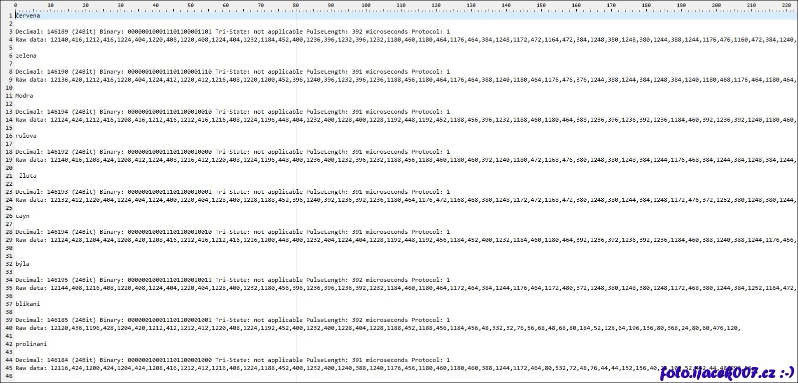 Záznam odchicených kódů pro ovládání světla na frekvenci 433MHz