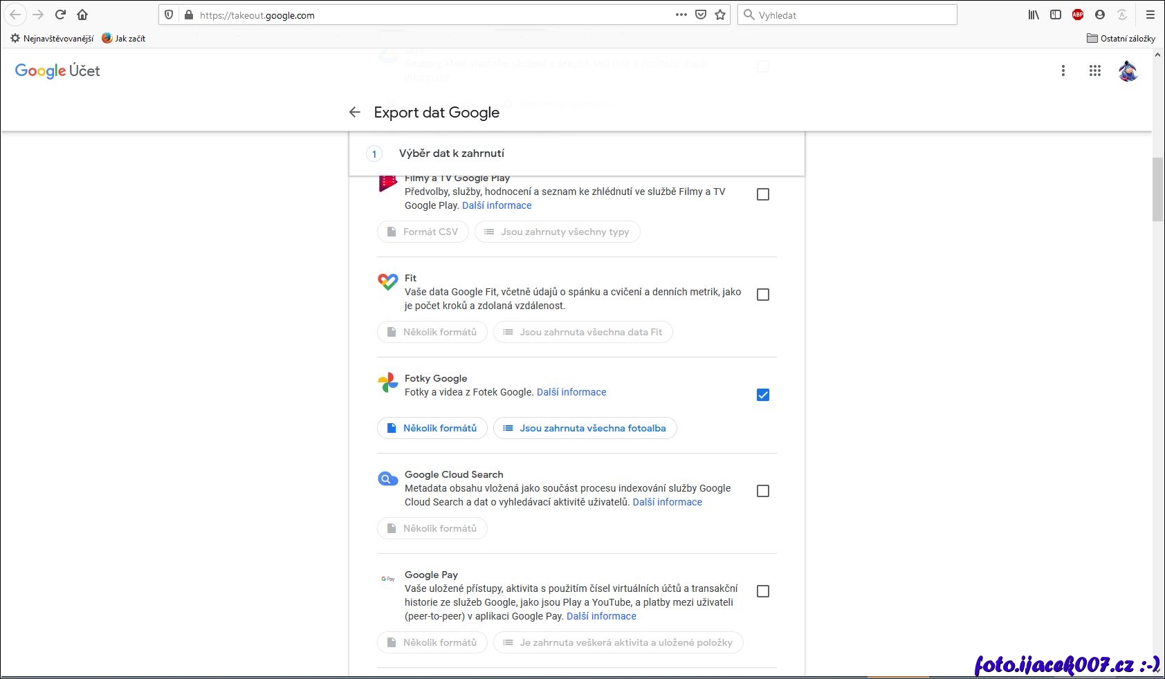 Volba exportu dat z aplikaci google