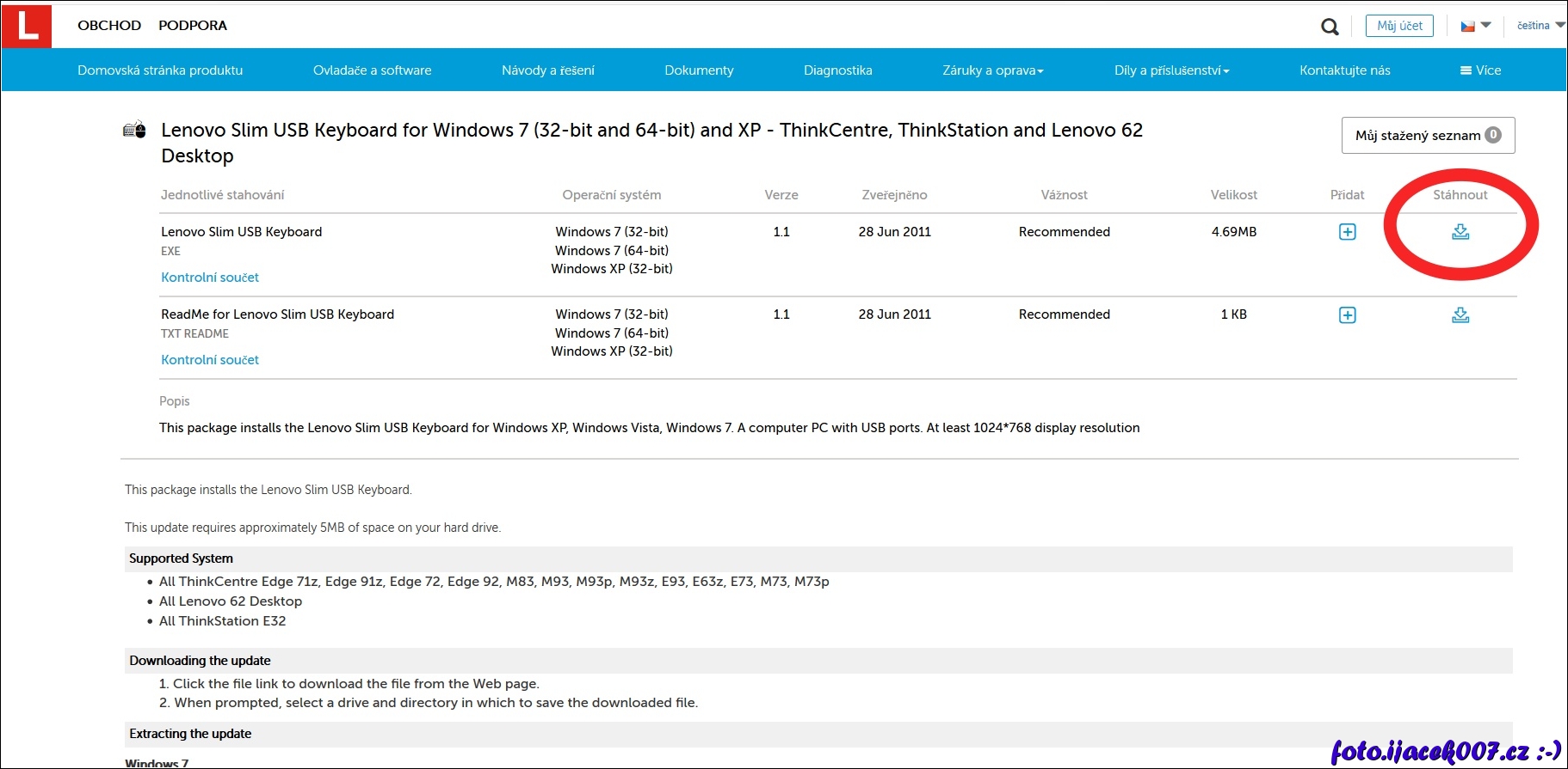 Stránka lenovo se stažením ovladače.
