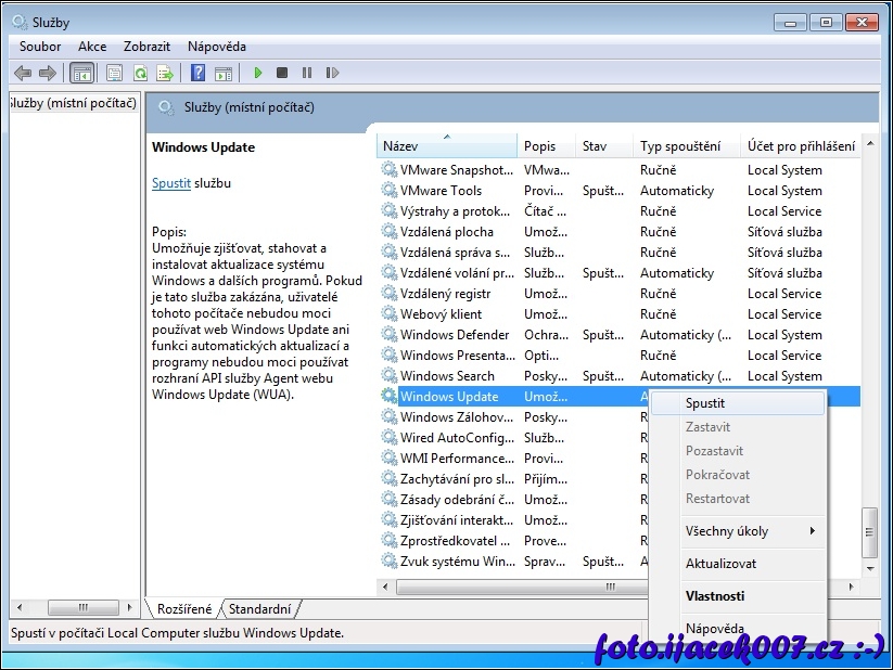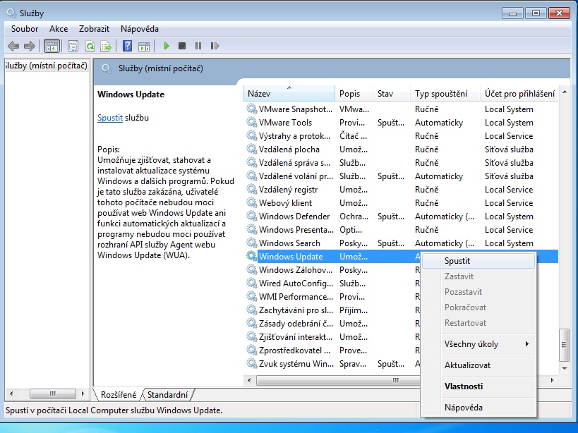 zapnutí služby Windows update