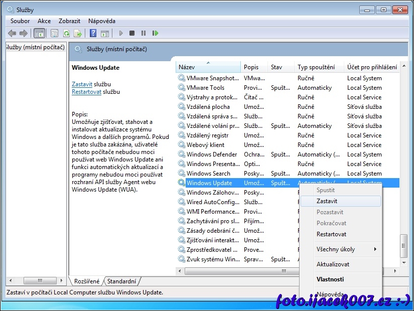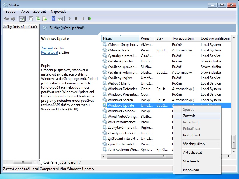zastavení služby Windows Update