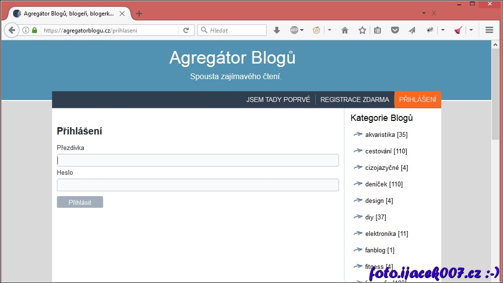 přihlašovací obrazovka na https portálu agregatorblogu.cz