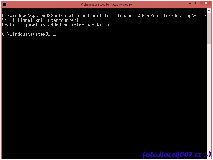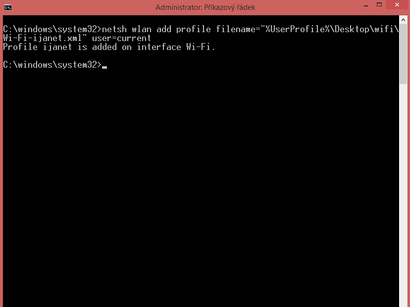 příklad příkazu pro import exportovaného profilu k wifi funguje za předpokladu že klič nebyl nastaven na zdrojovém pc nebo jde o ten samy systém kde prohýbal export.