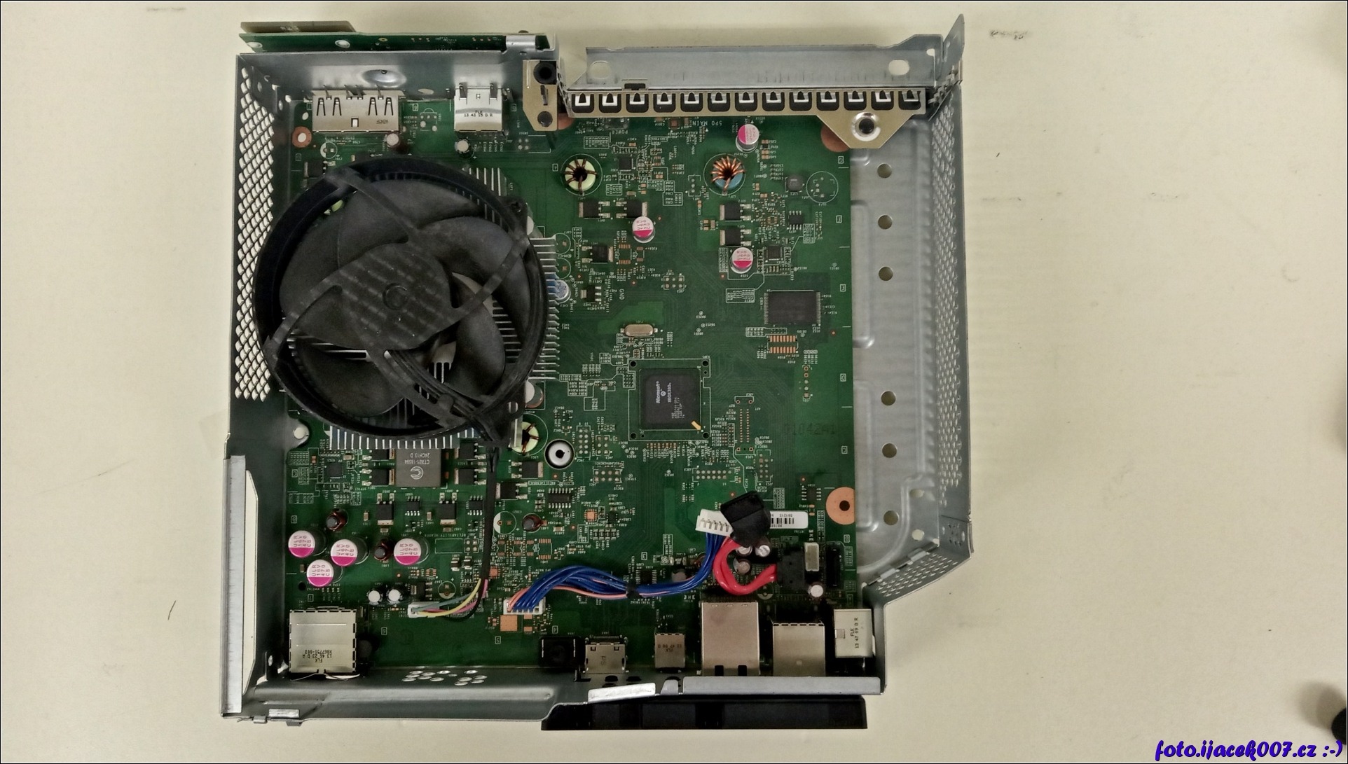 Pohled na vnitřek Xboxu a jeho základní desku upevněnou v plechovém rámu.