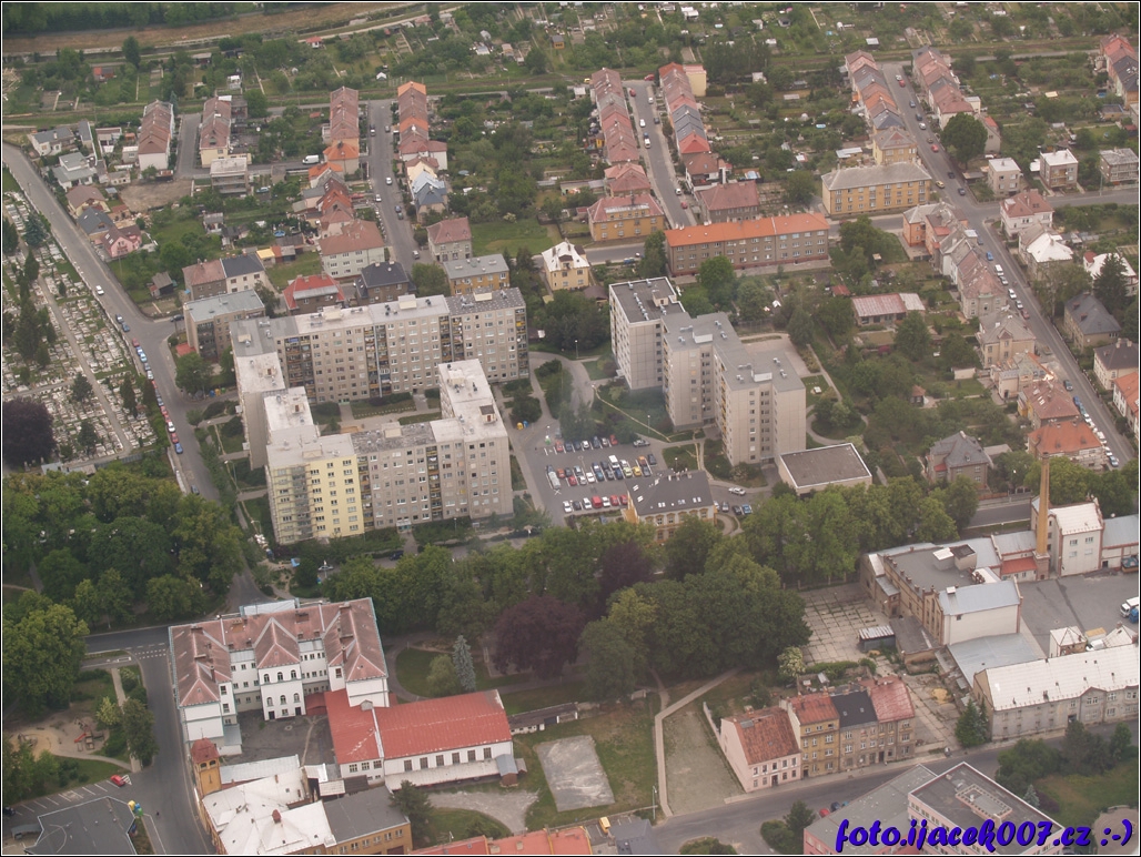 Pohled na 1. Základní školu a sídliště za ní.