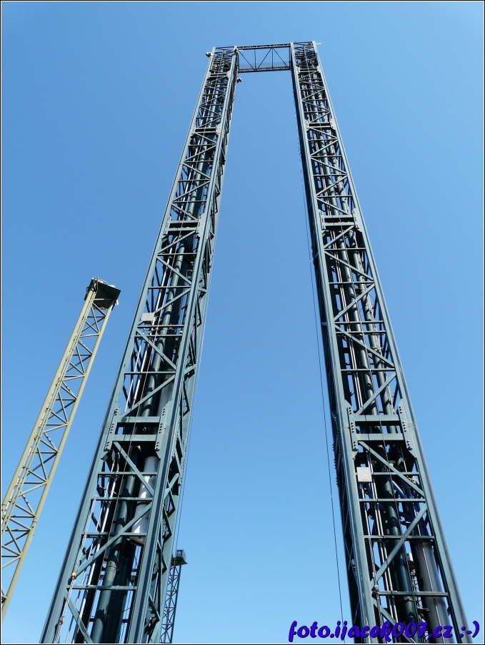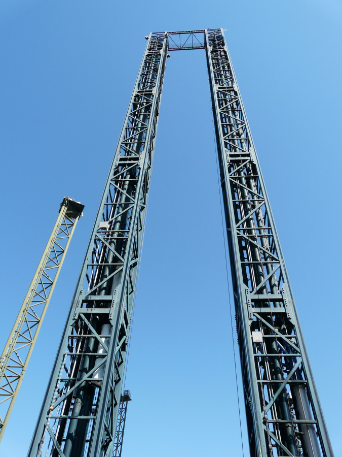 pohled na konstrukce atrakce columbia a discovery na nejniším sloupě je umístěný fotoaparát