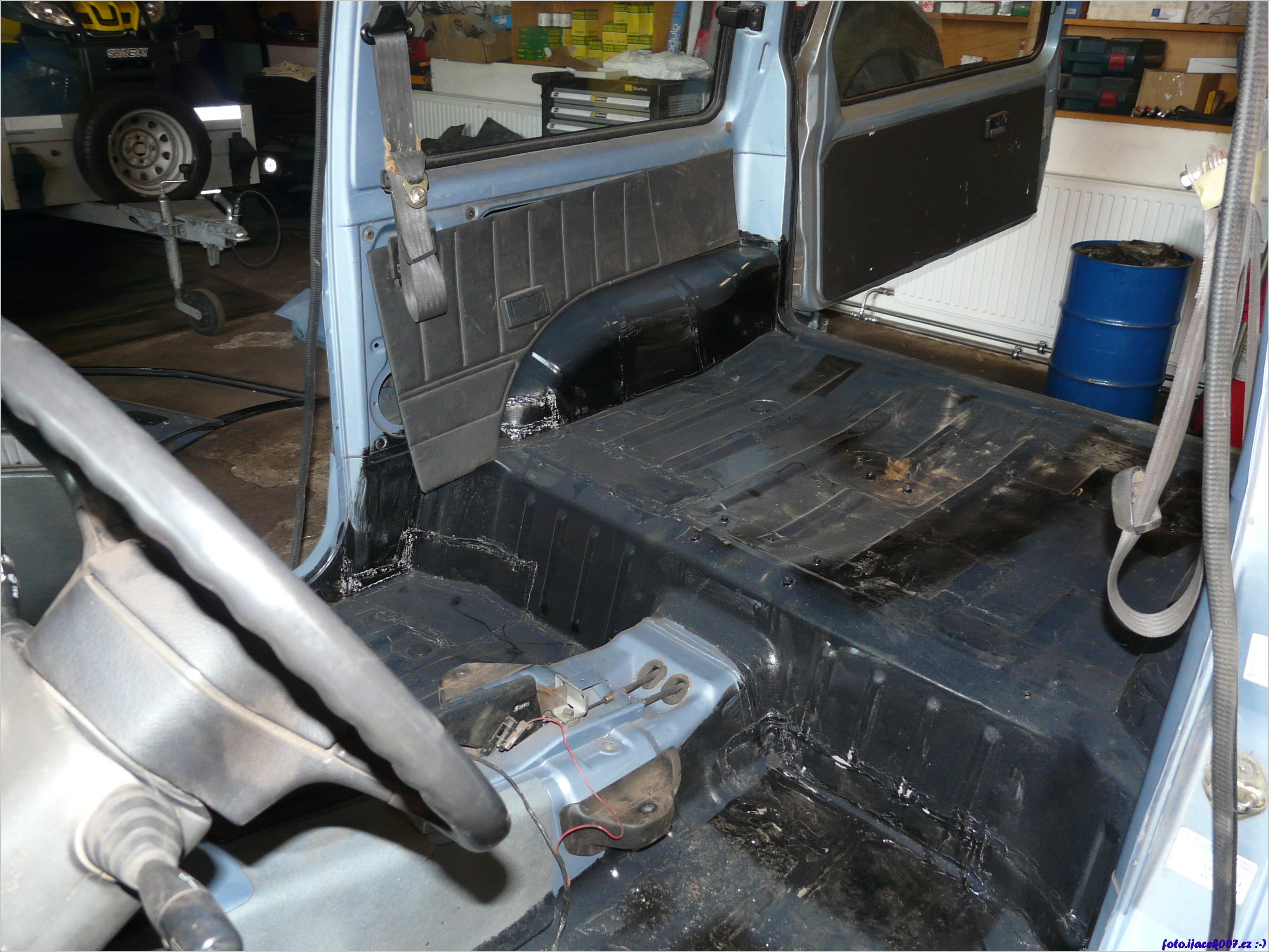 pohled do vnitřku auta s demontovaným sedačkami a sundanými koberci